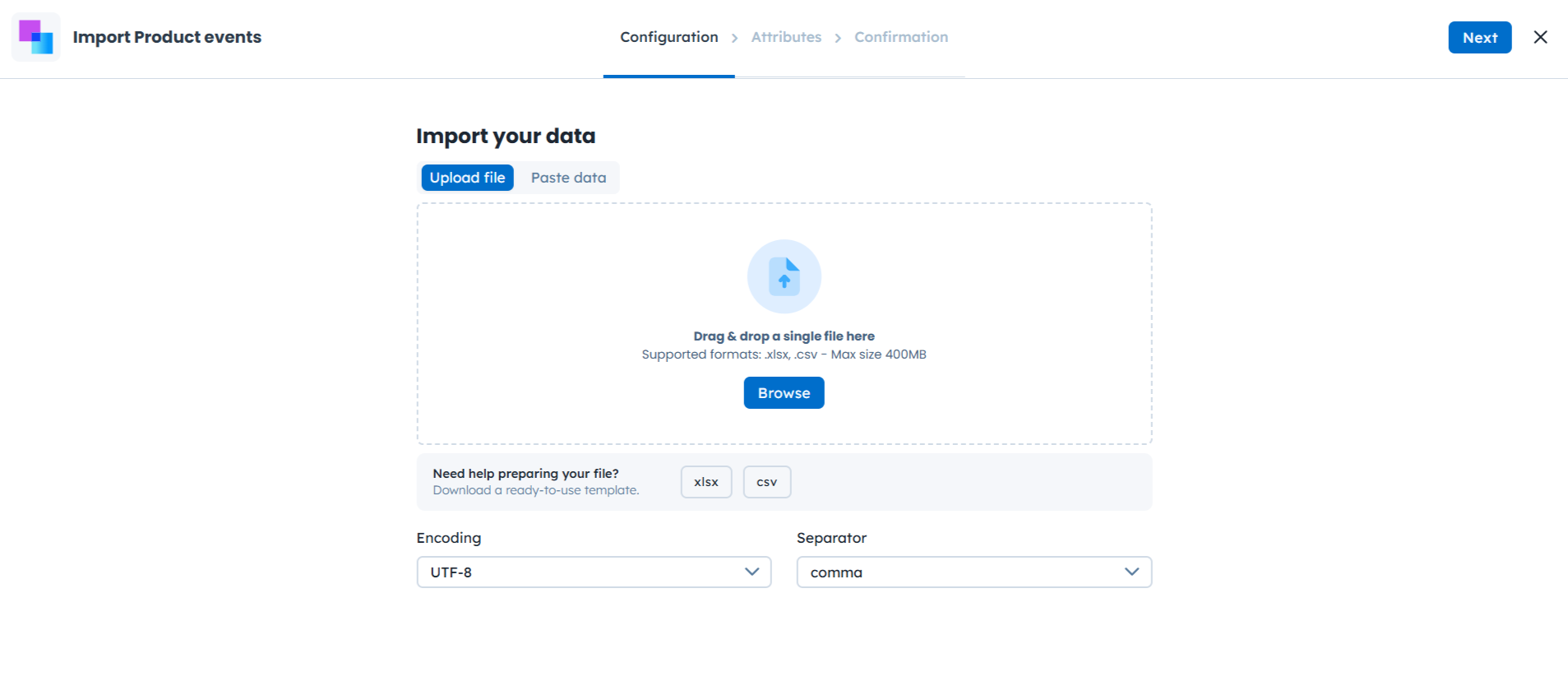 Before uploading, ensure your file is formatted correctly. If you aren't sure how your file should look, you can download a ready-to-use template directly from the app by clicking the “xlsx” or “csv” button in the “Data” → “Import” section.