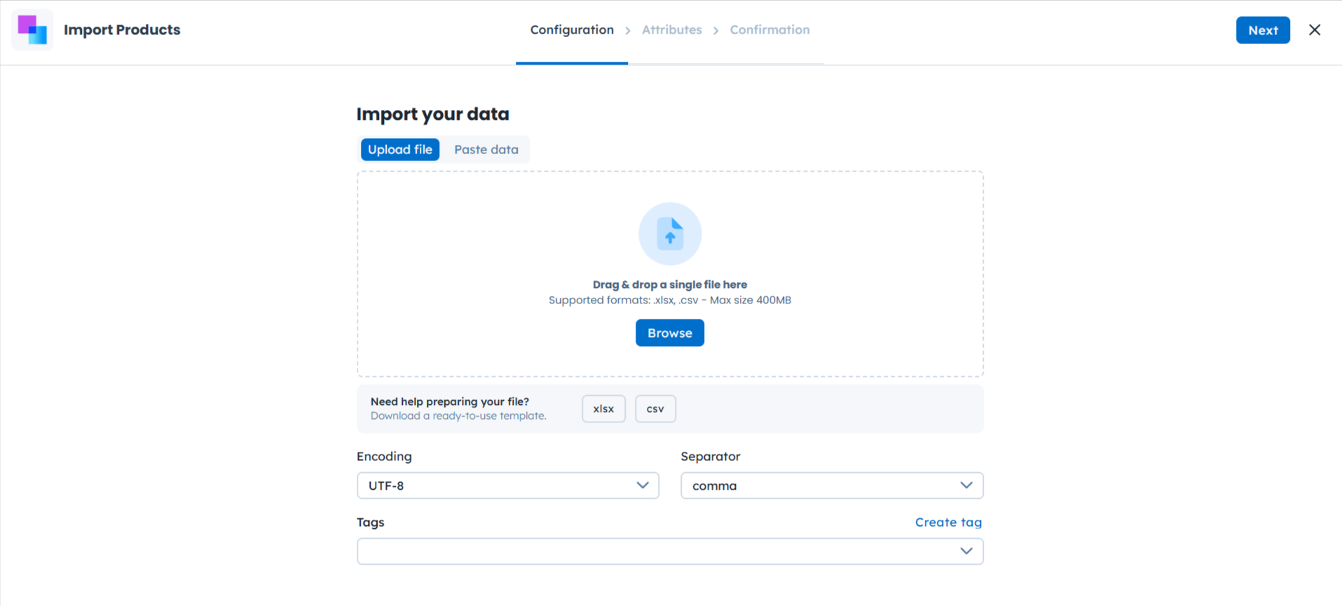 Before uploading, ensure your file is formatted correctly. If you aren't sure how your file should look, you can download a ready-to-use template directly from the app by clicking the “xlsx” or “csv” button in the “Data” → “Import” section.