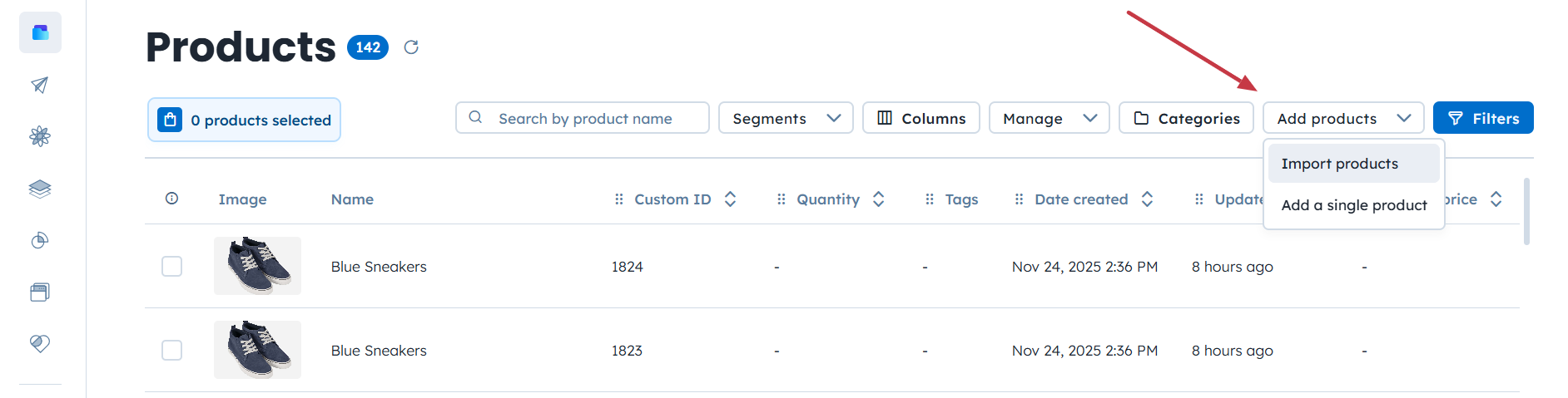 You can use the same import process to update existing products. To update a poduct, the system must recognize it by “custom_id” attribute.