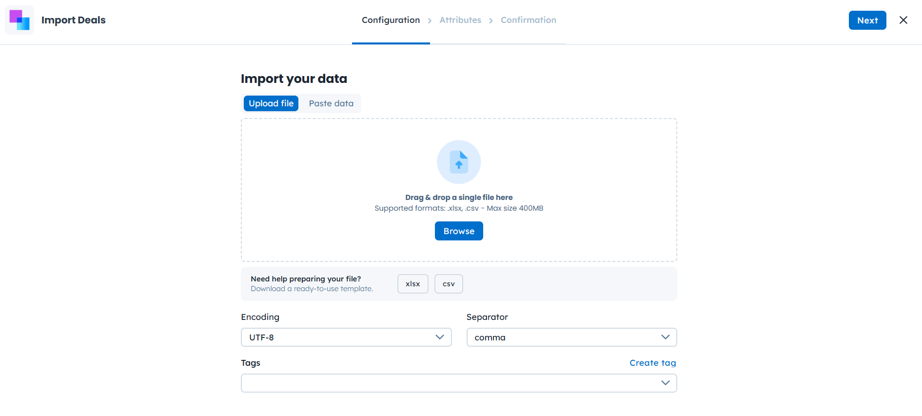 Before uploading, ensure your file is formatted correctly. If you aren't sure how your file should look, you can download a ready-to-use template directly from the app by clicking the “xlsx” or “csv” button in the “Data” → “Import” section.