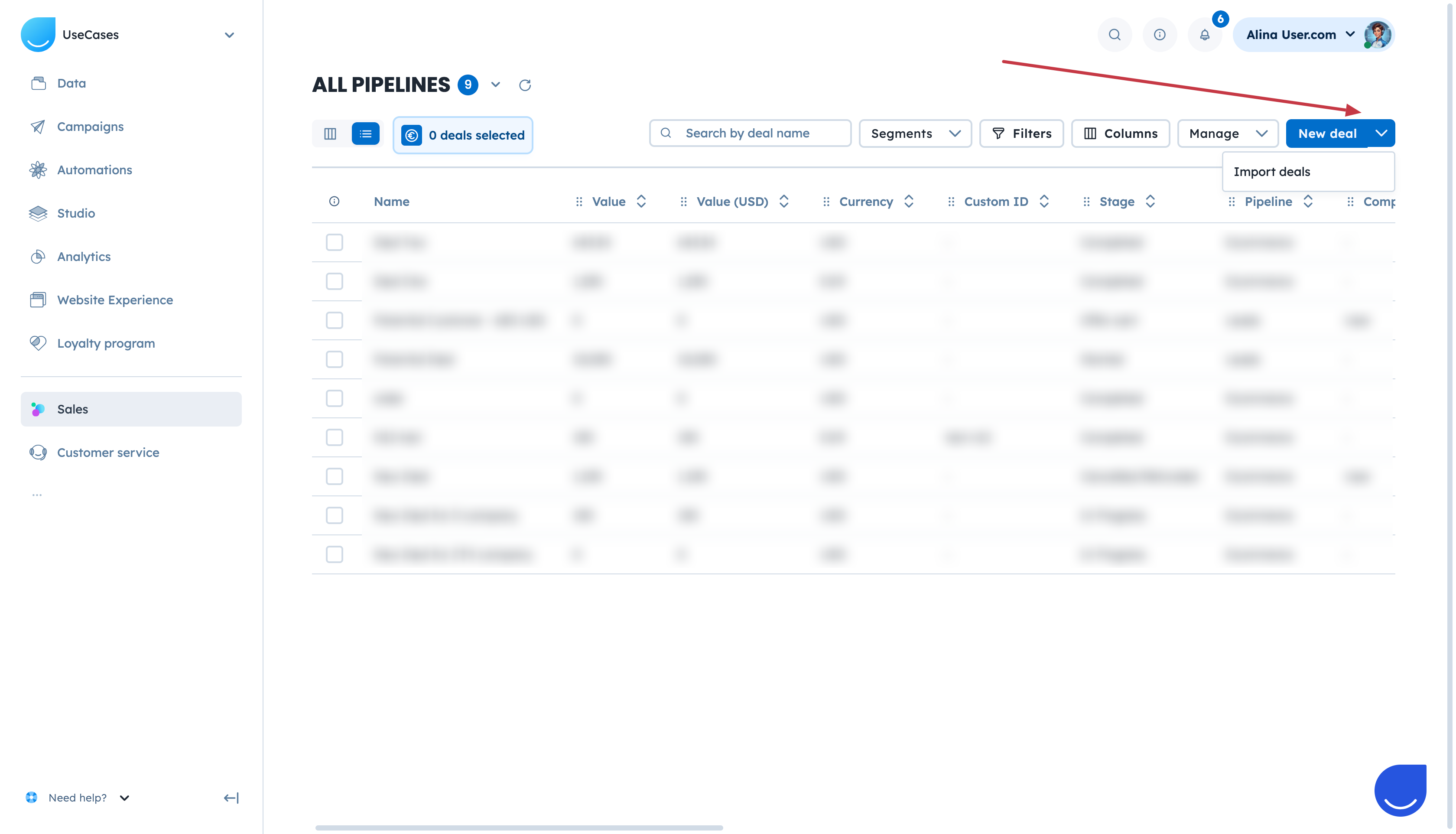To view the newly imported profiles, go to “Sales” → “Deals”→ table view. You can filter your deals by the specific attributes or tag you attached during the import to easily review the imported data.