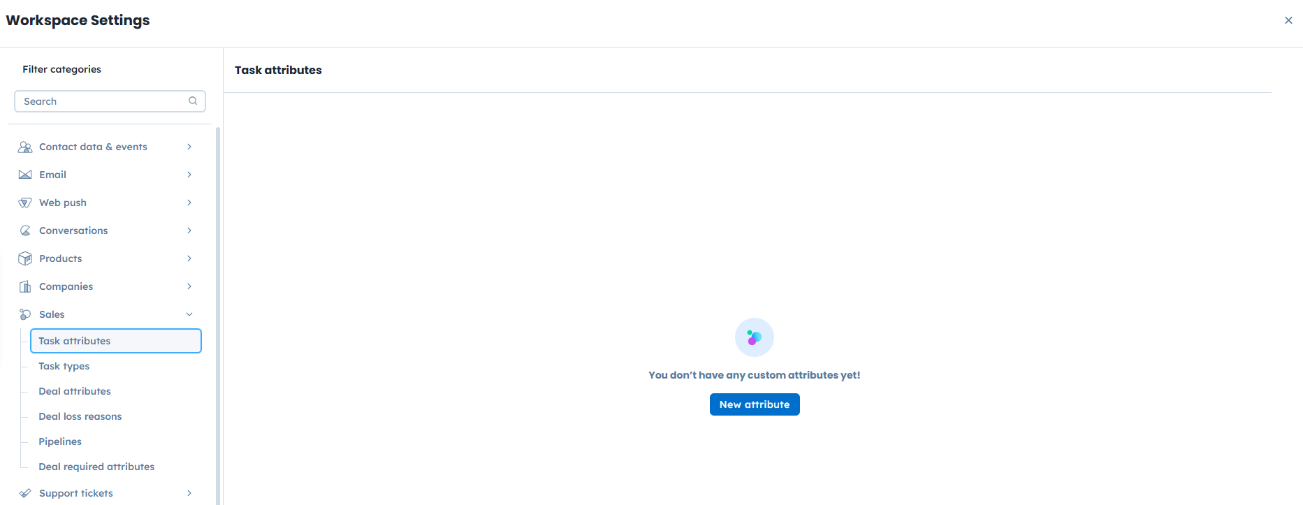 Attributes are the fields that characterize the objects like Contacts, Companies, or Deals. If you want to find out more about the basics of attributes, their types, and use cases, please check this article.[LINK]