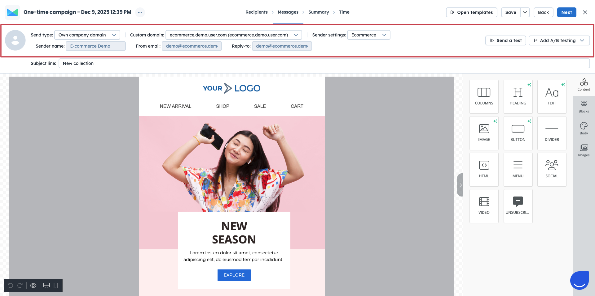 Once you reach the “Message” stage in the campaign creation flow, you need to decide on the email domain and email sender for this specific delivery.