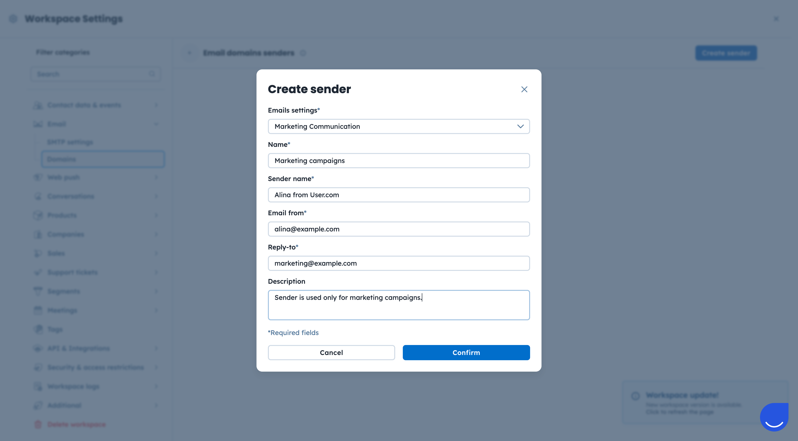 Configuring senders for your domain ensures that each type of communication - marketing newsletters, sales outreach, and support messages - is delivered from the correct, trusted address. Setting up multiple senders under one authenticated domain helps maintain brand consistency, improves deliverability, and keeps your messaging aligned with each team’s purpose.