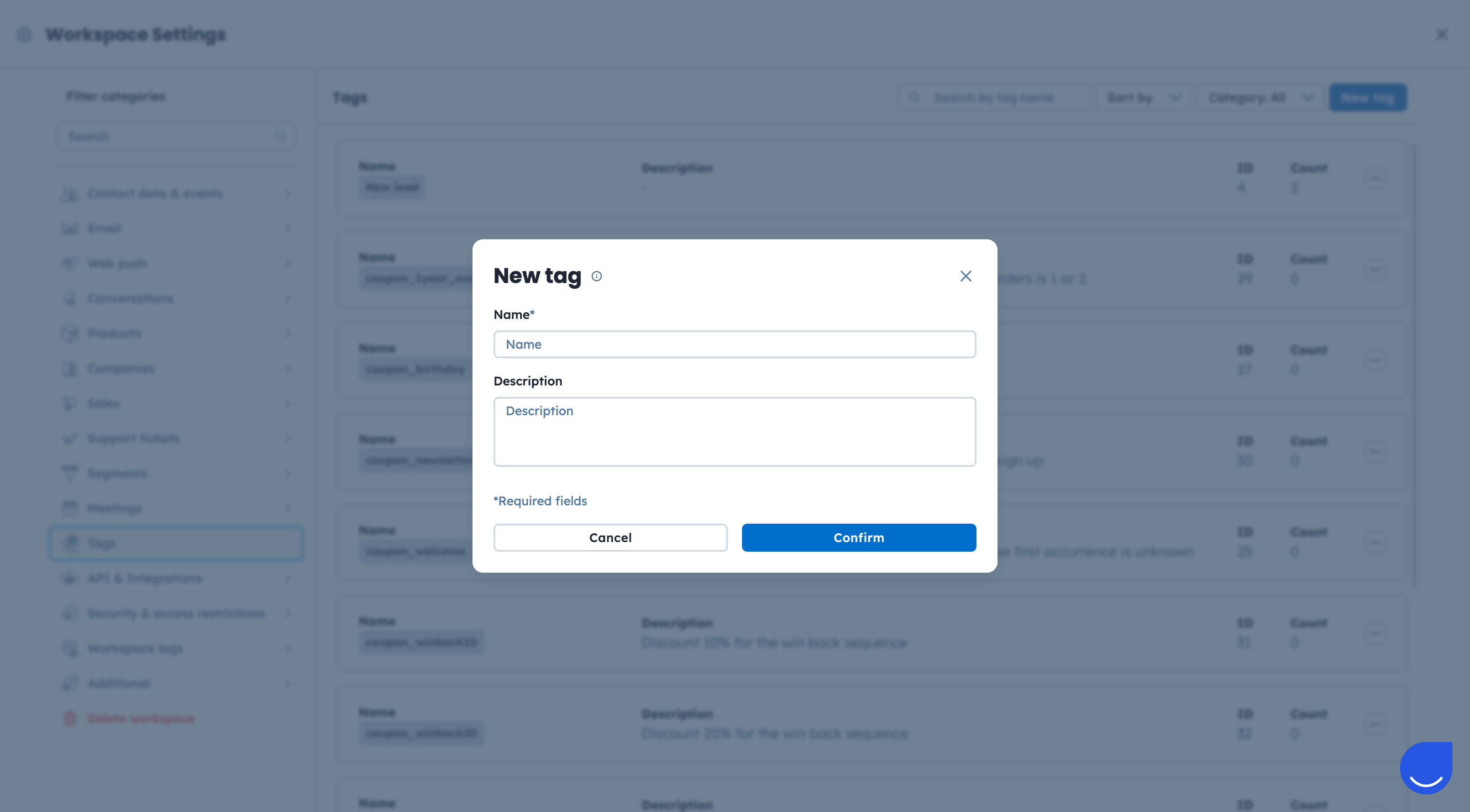 Tags are one of the simplest and most flexible ways to organize data in User.com. You can use them to label contacts, companies, deals, tickets, products, and conversations, making segmentation, filtering, and targeting much easier in your daily work.