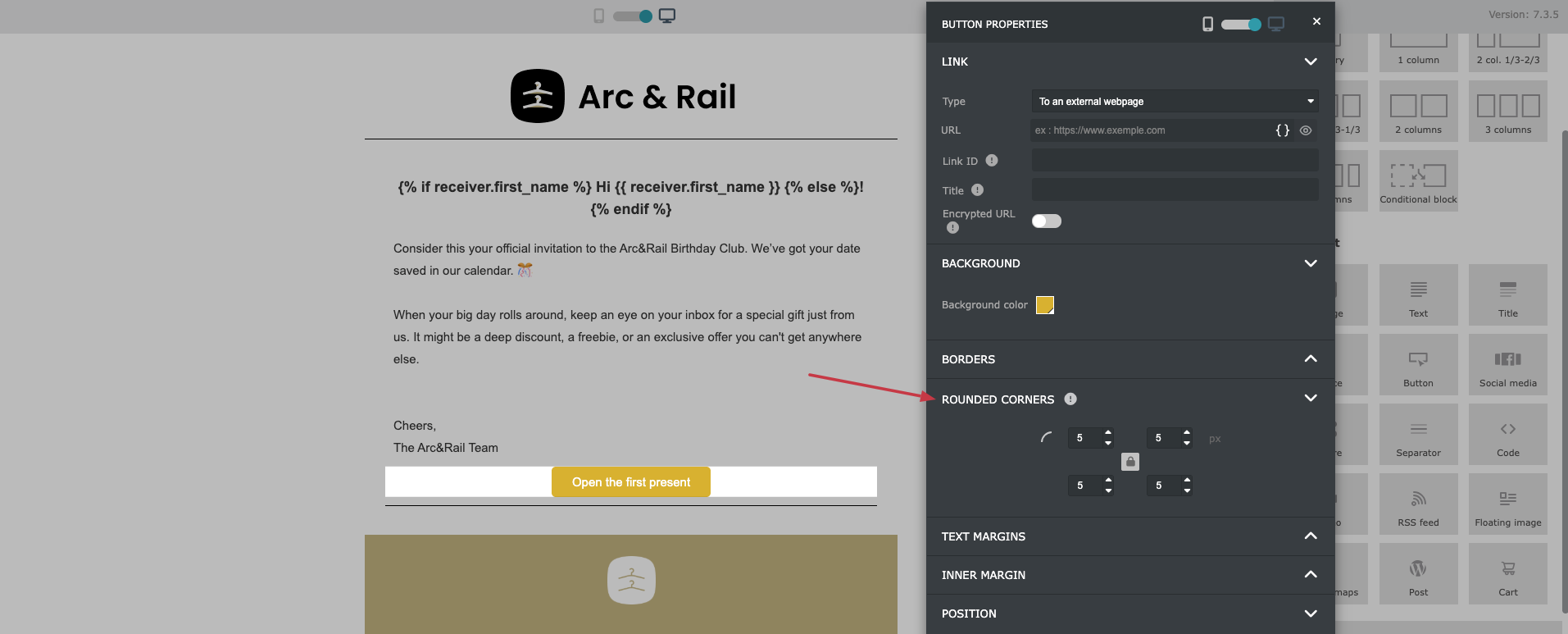Native Email Builder: Rounded corners are a built-in configuration option available for each element.