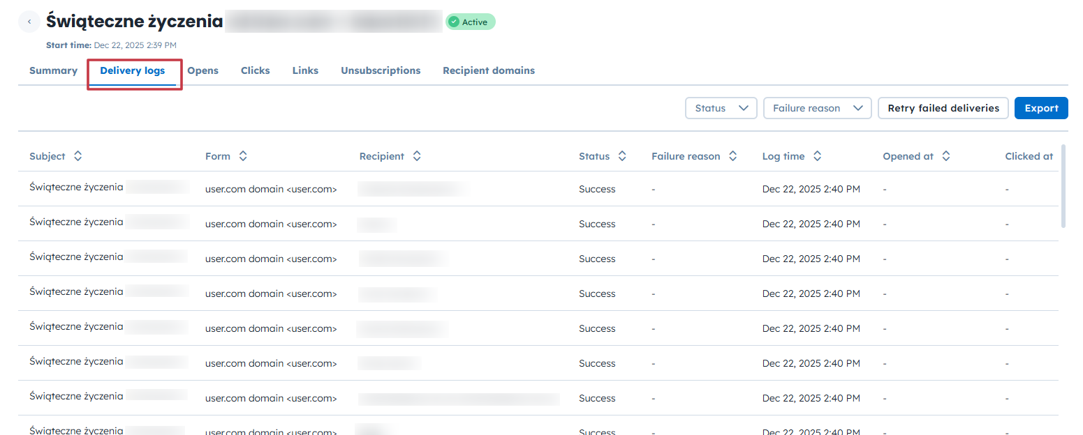 The “Delivery logs” view presents a detailed list of all sent emails. You can see: