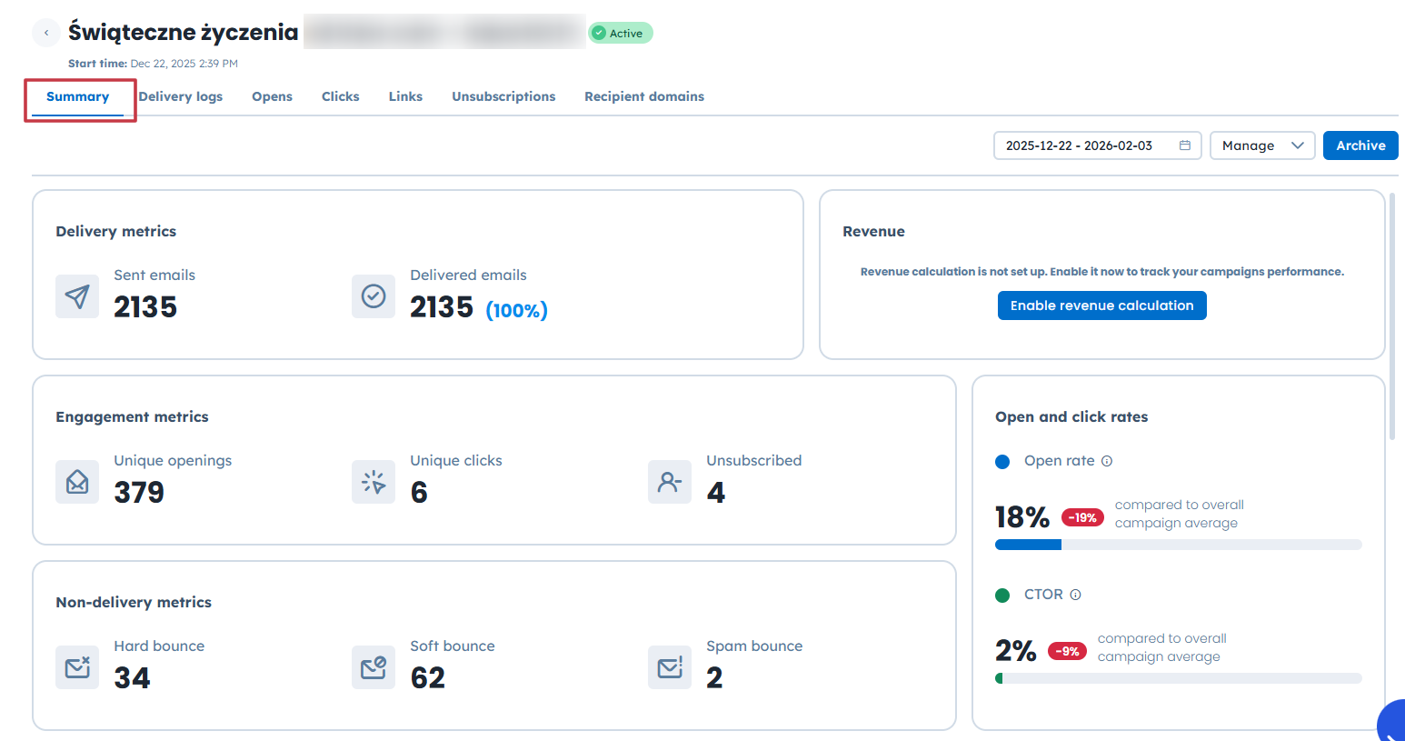 Delivery metrics: Here you can heck how many emails were sent vs how many of them got delivered.