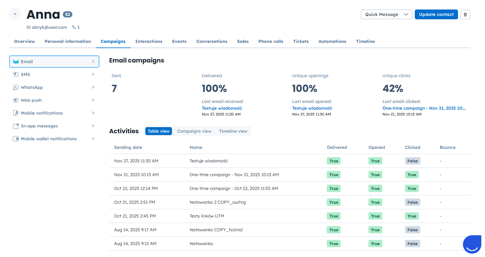 Monitor individual email engagement with detailed information about who opened your message and when, including the specific message and timestamp. This visibility helps you track contact activity, identify the best timing for follow-ups, assess engagement trends over time, and support more informed sales and marketing decisions based on real interaction data.