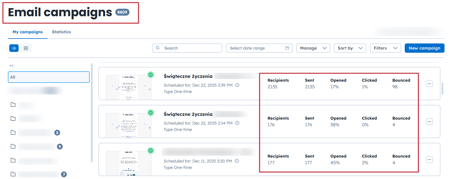 To see the main results of your campaigns, go to the “Campaigns” section. In the campaign list, you can find key metrics such as: