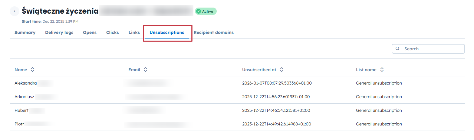 This section displays a full list of contacts who clicked the Unsubscribe link in your email campaign, helping you quickly identify opt-outs, monitor audience retention, and analyze potential issues with campaign content, targeting, or sending frequency.