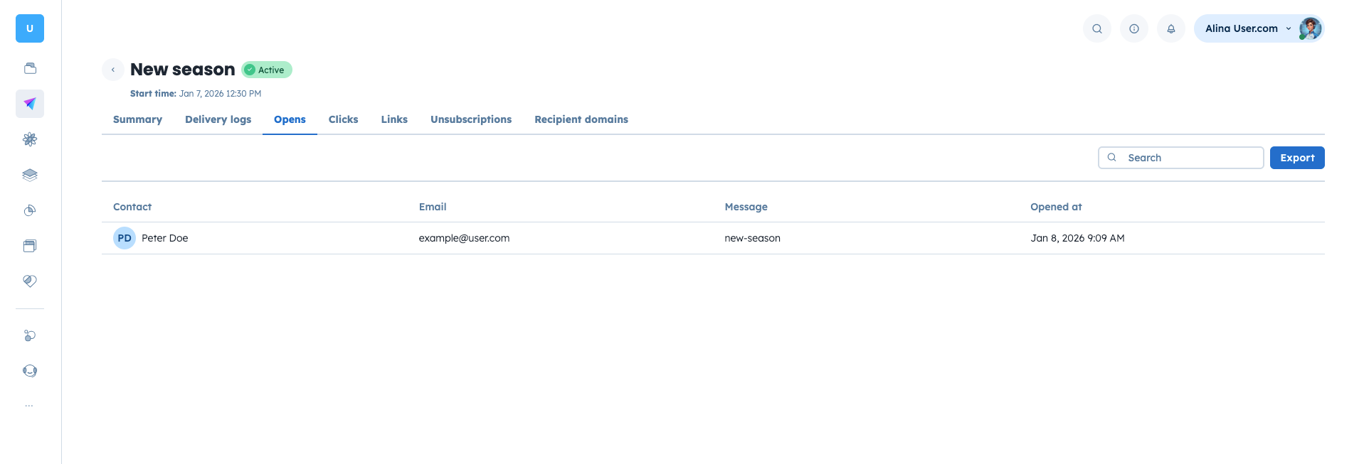Measuring email performance helps you understand how your audience reacts to your messages and where you can improve. In User.com, email campaign statistics give you both high-level results and detailed, user-level insights, so you can optimize future campaigns based on real data.
