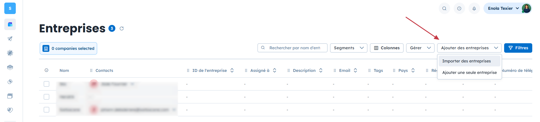 Accédez à “Données” → “Entreprises” → “Ajouter des entreprises” → “Importer des entreprises”.