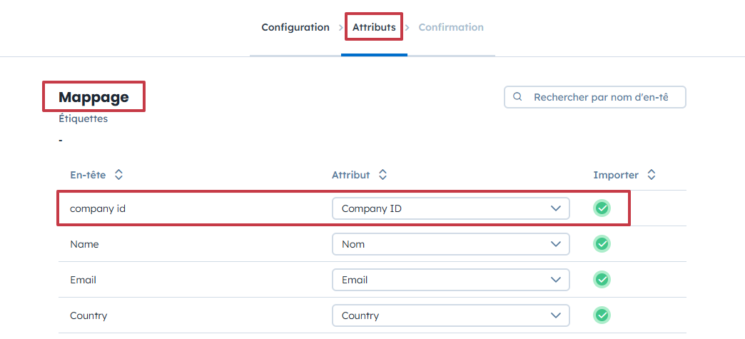 Correspondance avec les attributs standards : Si les colonnes de votre fichier sont des attributs standards, vous pourrez lancer l’import immédiatement.