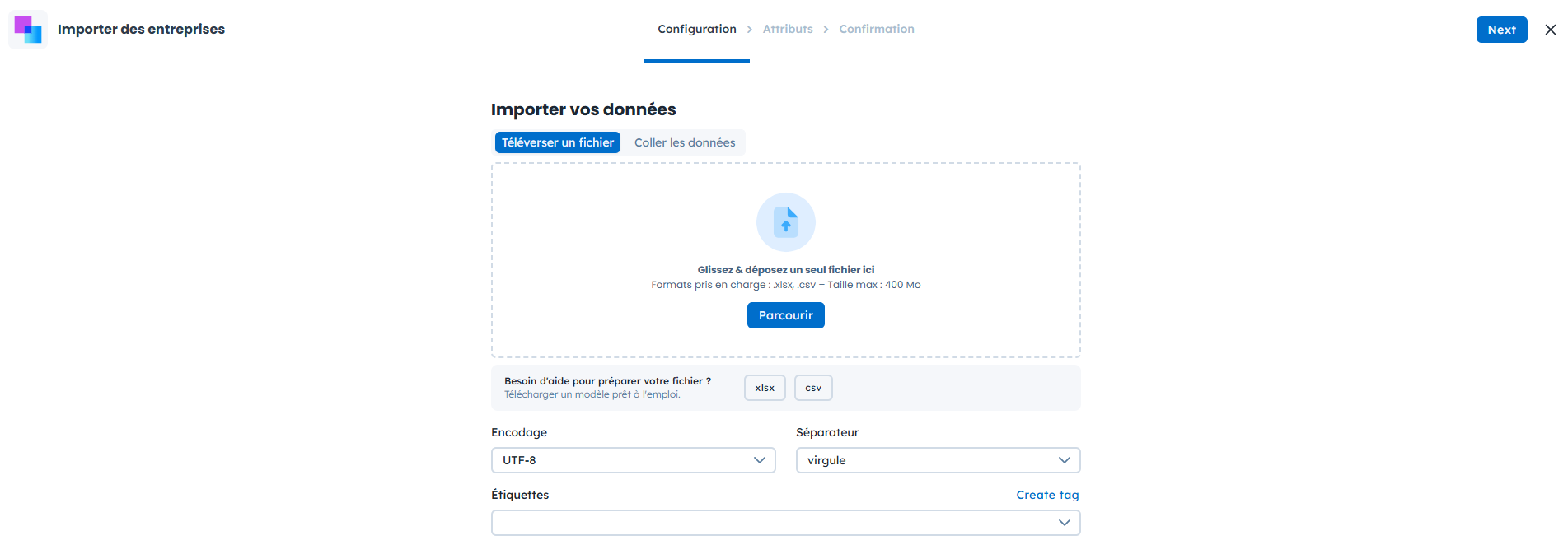 Avant d’importer votre fichier, assurez-vous qu’il est correctement formaté. Si vous n'êtes pas sûr de la structure à adopter, vous pouvez télécharger un modèle prêt à l'emploi directement depuis l'application en cliquant sur le bouton “xlsx” ou “csv” dans la section “Données” → “Importateurs”.