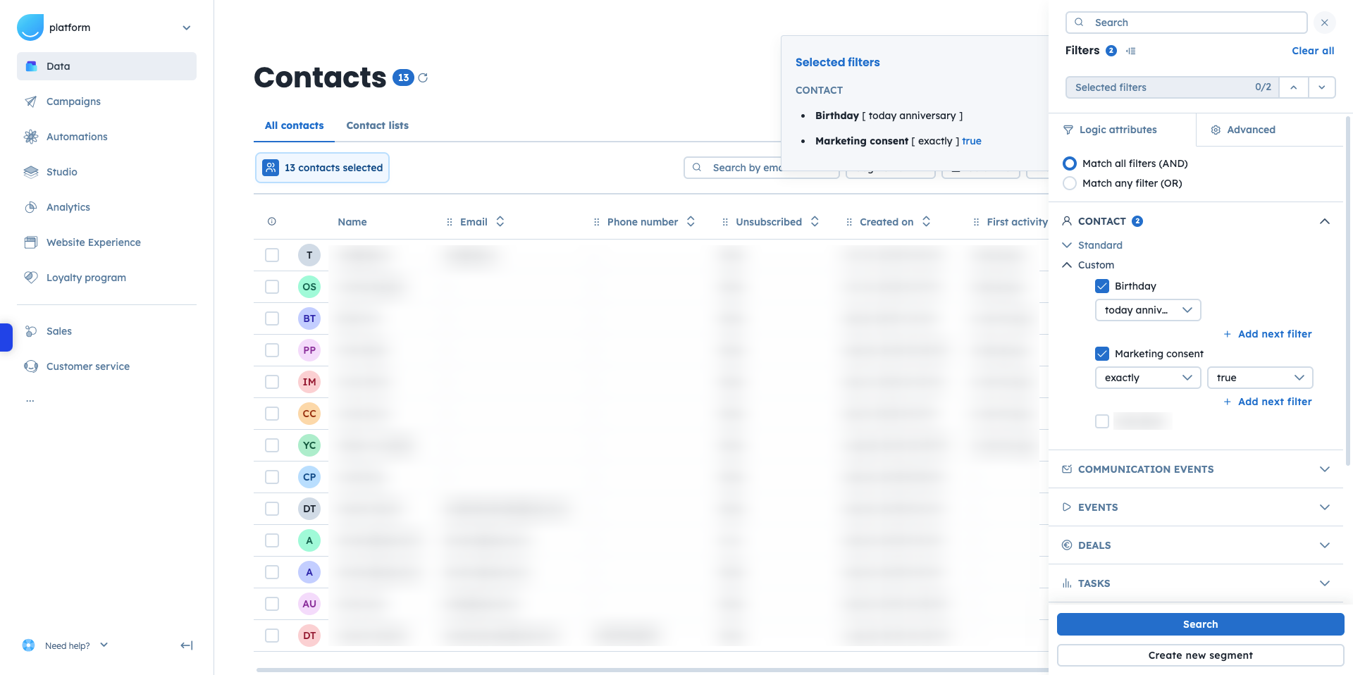 Utilisez les filtres pour segmenter vos données en fonction des valeurs des attributs. Par exemple, affichez uniquement les contacts avec « Consentement marketing = vrai » ou les produits avec « Prix > 100 ». Selon le type de données contenues dans les attributs, différentes options de filtrage sont disponibles pour affiner votre recherche et organiser efficacement vos données.
