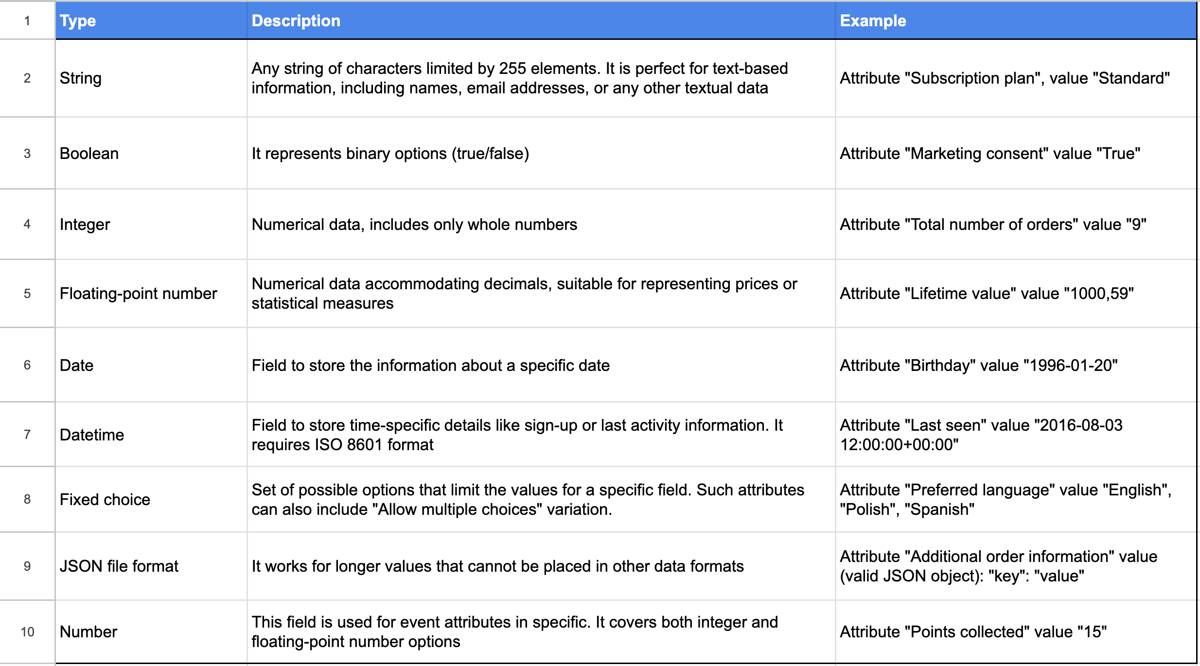 REMARQUE ! Créez toujours les attributs dans l'application avant d'envoyer les données. Cela vous permet de définir correctement les types d'attributs et de conserver une nomenclature cohérente.