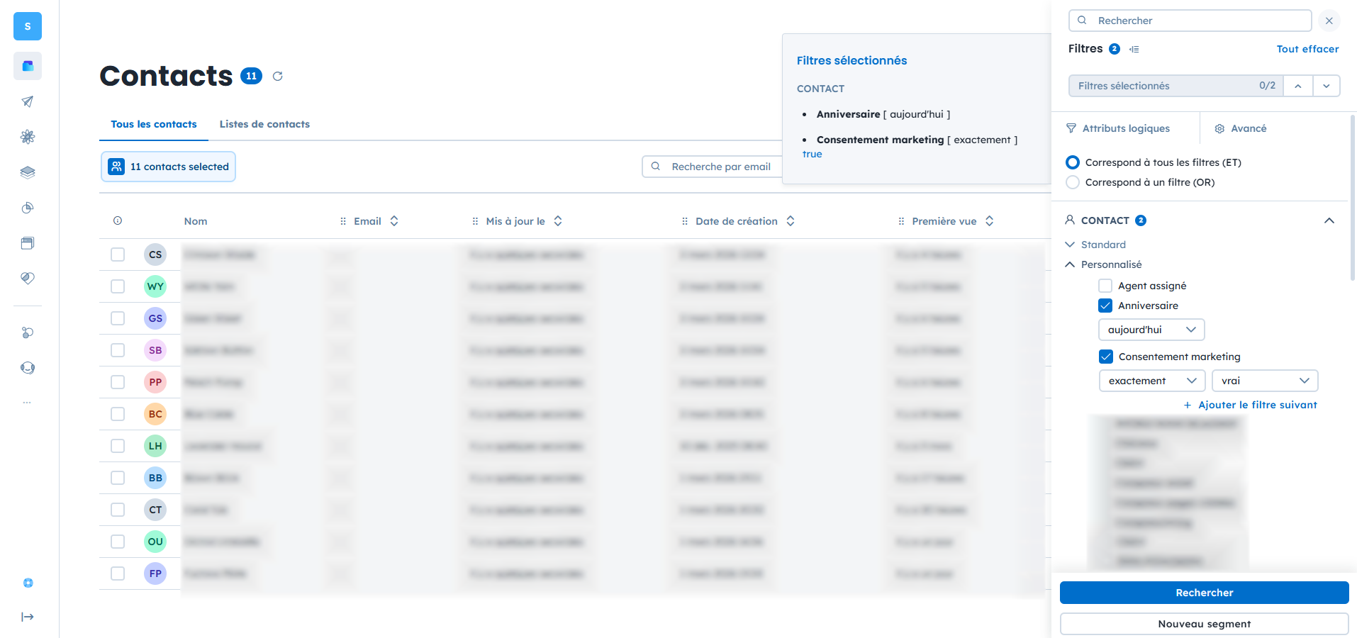 Les filtres permettent de segmenter vos données selon les valeurs d’attribut. Par exemple : afficher uniquement les contacts avec “Consentement marketing = true” ou les produits avec “Prix > 100”. Selon le type de données de l’attribut, différentes options de filtrage sont disponibles pour affiner la recherche et organiser vos données efficacement.
