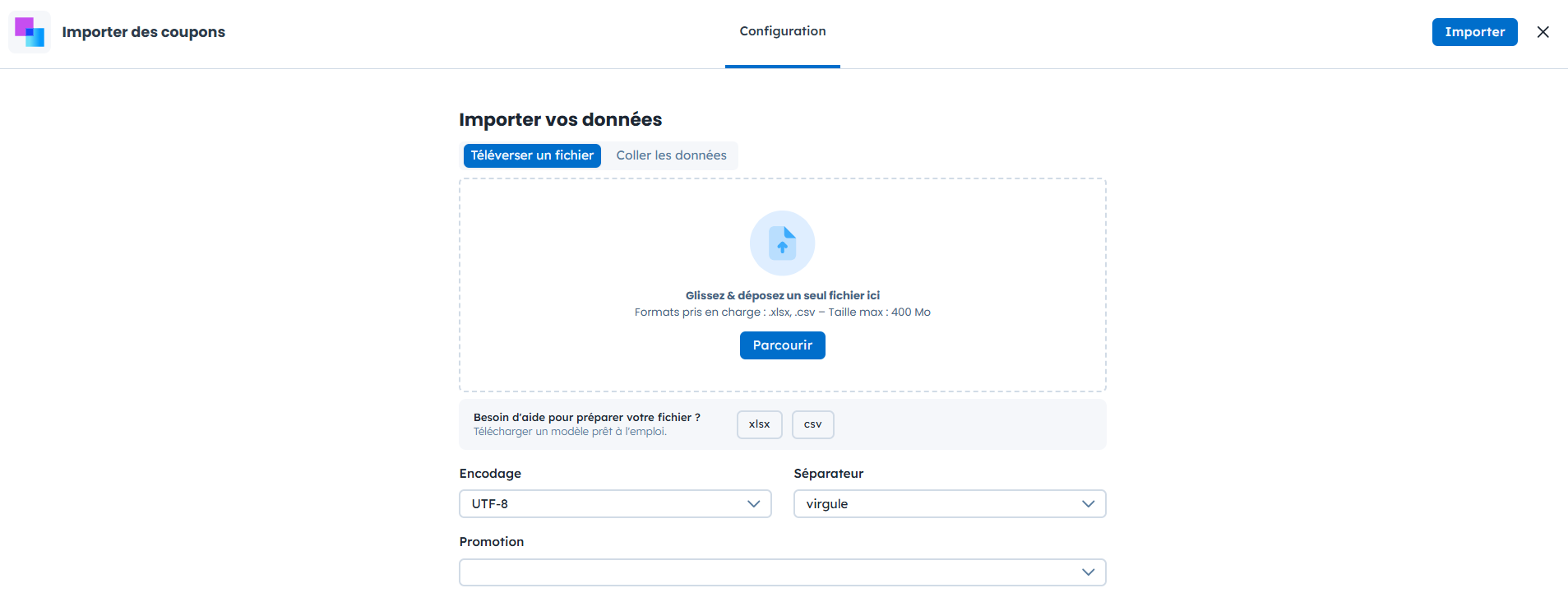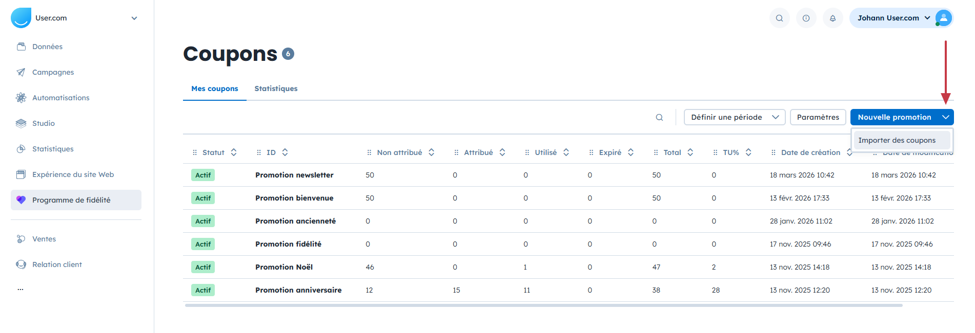 Accédez à “Programme de fidélité” → “Coupons” → cliquez sur la flèche à côté du bouton “Nouvelle promotion” → “Importer des coupons”.