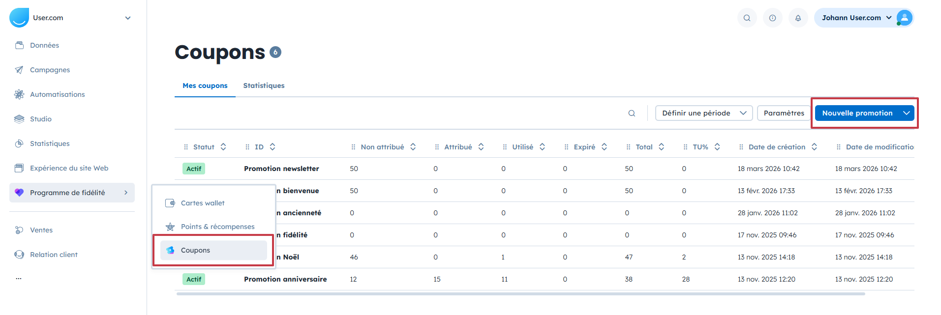 Pour consulter les nouveaux coupons importés, rendez-vous dans “Programme de fidélité” → “Coupons”. Vous y retrouverez l’ensemble de vos promotions.