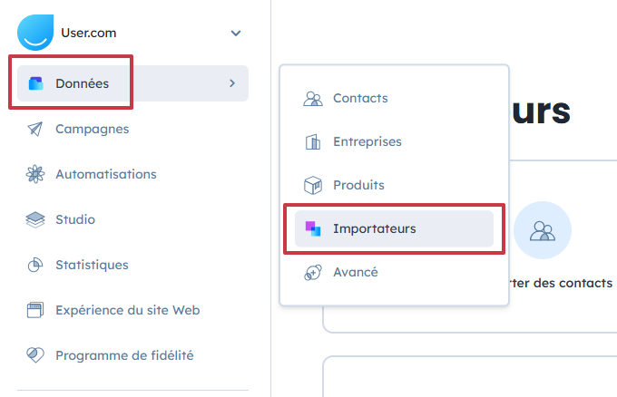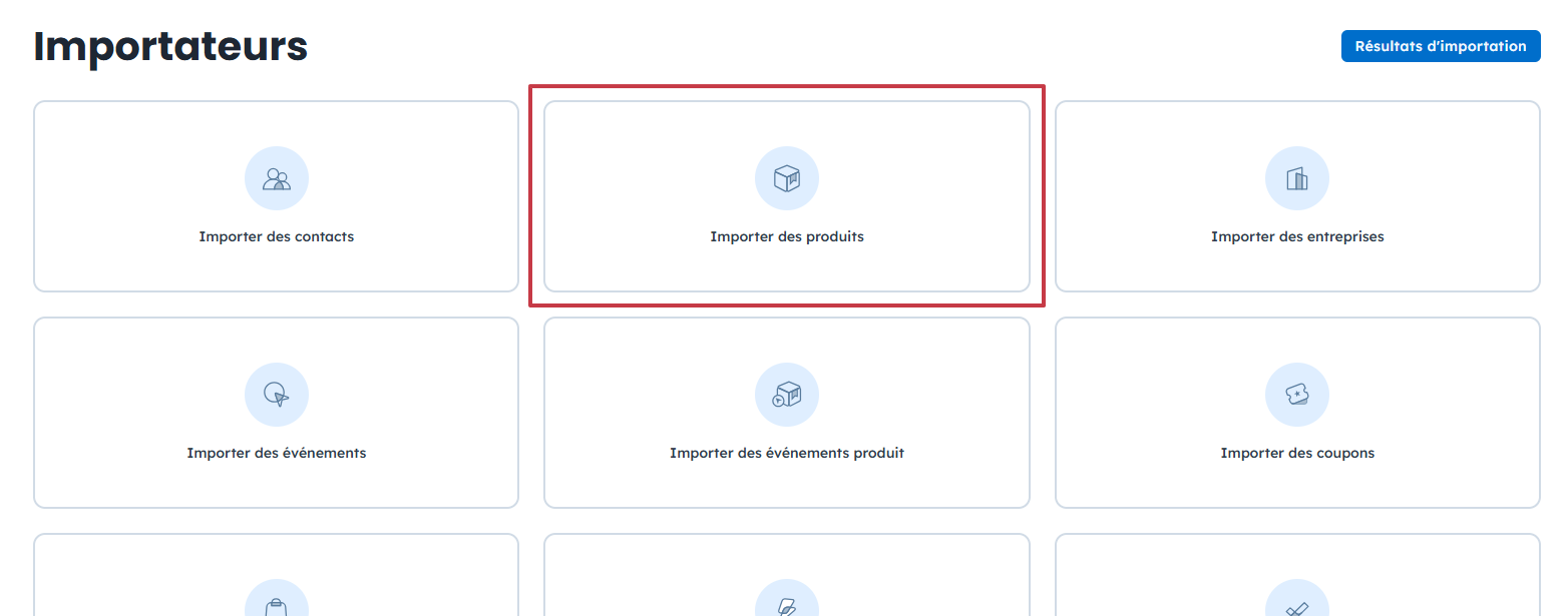 Accédez à “Données” → “Importateurs” et sélectionnez “Importer des produits”.