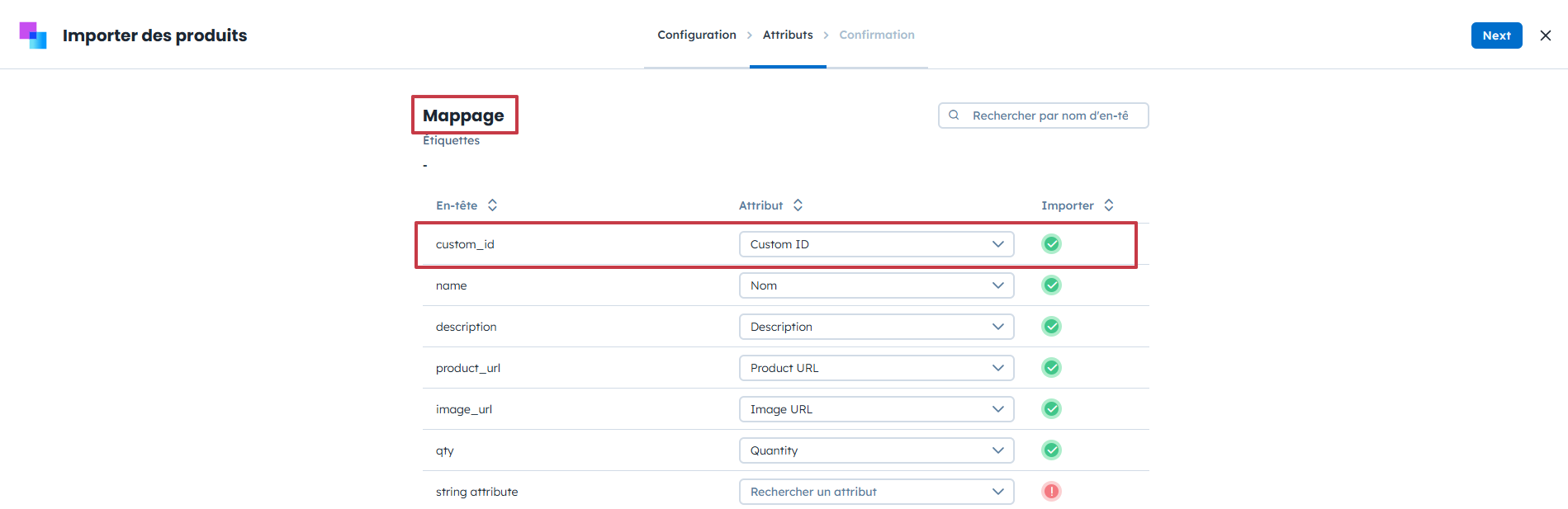 Correspondance avec les attributs standards : Si les colonnes de votre fichier correspondent aux attributs standards, vous pourrez lancer l’import immédiatement.