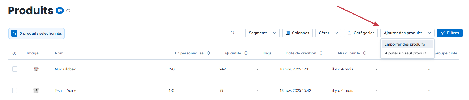 Vous pouvez utiliser ce même processus pour mettre à jour des produits existants. Pour cela, le système doit reconnaître le produit via l’attribut “ID personnalisé” (“custom_id”).