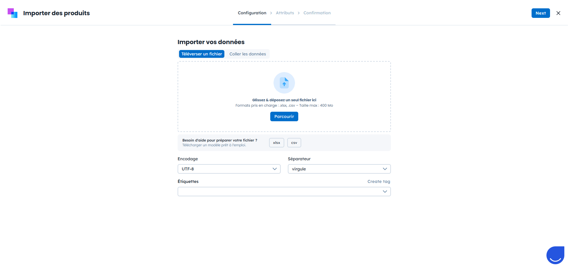 Avant d’importer votre fichier, assurez-vous qu’il est correctement formaté. Si vous n'êtes pas sûr de la structure à adopter, vous pouvez télécharger un modèle prêt à l'emploi directement depuis l'application en cliquant sur le bouton “xlsx” ou “csv” dans la section “Données” → “Importateurs”.