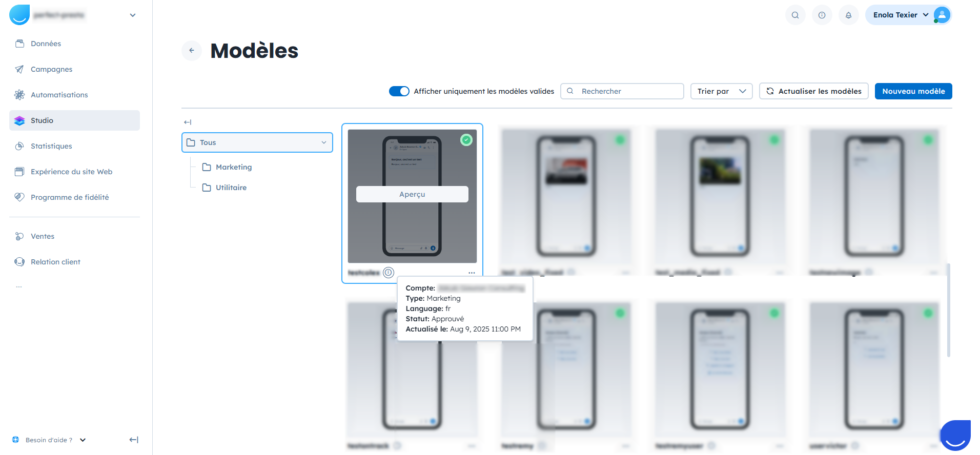 Pour y accéder, rendez-vous dans la section “Campagnes” → “WhatsApp” → “Gérer” → “Modèles”.