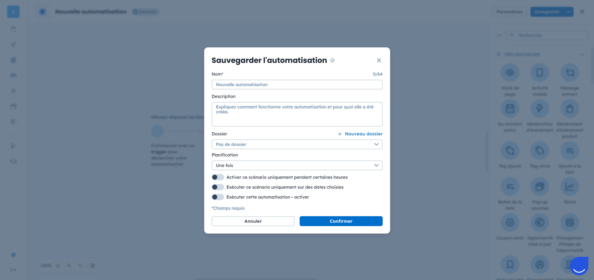 Les paramètres d’automatisation correspondent aux règles de base d’un workflow. Ils sont accessibles depuis la fenêtre de configuration qui s’ouvre après avoir cliqué sur “Enregistrer et quitter” ou “Paramètres” lors de la création ou de l’édition d’une d’automatisation. Ces paramètres vous permettent de définir quand et à quelle fréquence le scénario se déclenche, ainsi que d’organiser vos automatisations dans des dossiers pour mieux les gérer.