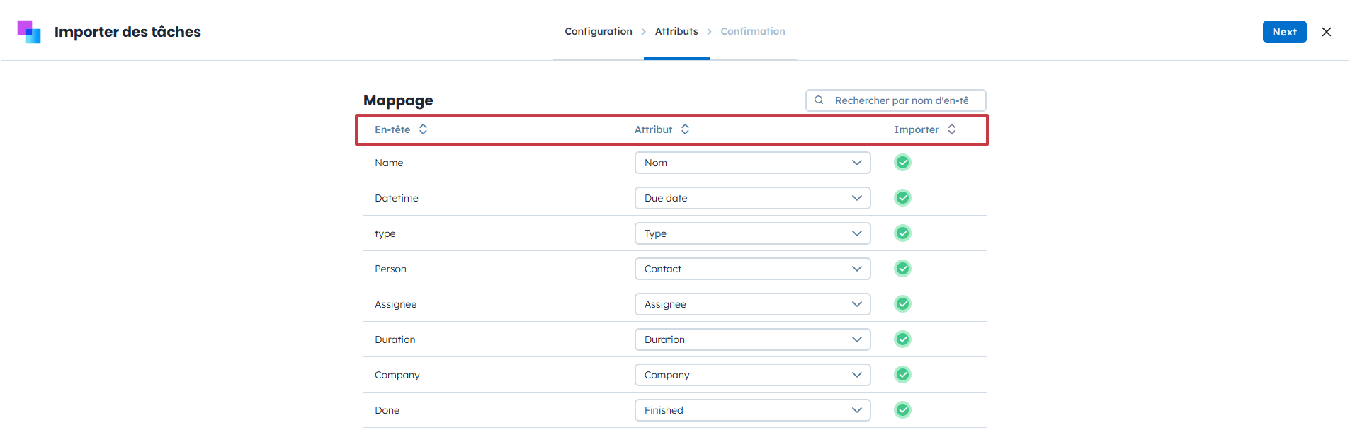 Correspondance avec les attributs standards : Si les colonnes de votre fichier correspondent aux attributs standards, vous pourrez lancer l’import immédiatement.