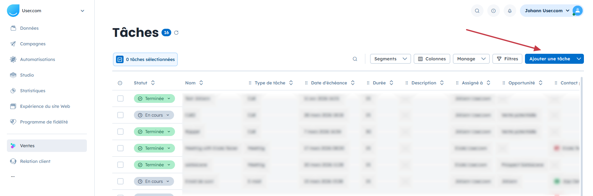 Pour consulter les nouvelles tâches importées, rendez-vous dans “Ventes” → “Tâches”. Vous pouvez filtrer vos tâches pour les retrouver facilement.