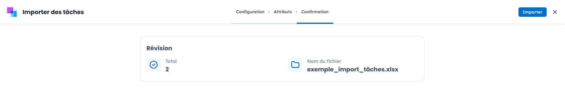 Lors de l’étape “Confirmation”, vous pouvez vérifier le récapitulatif de l’import avant de valider l’opération. Une fois l’import confirmé, le système commence à traiter votre fichier.
