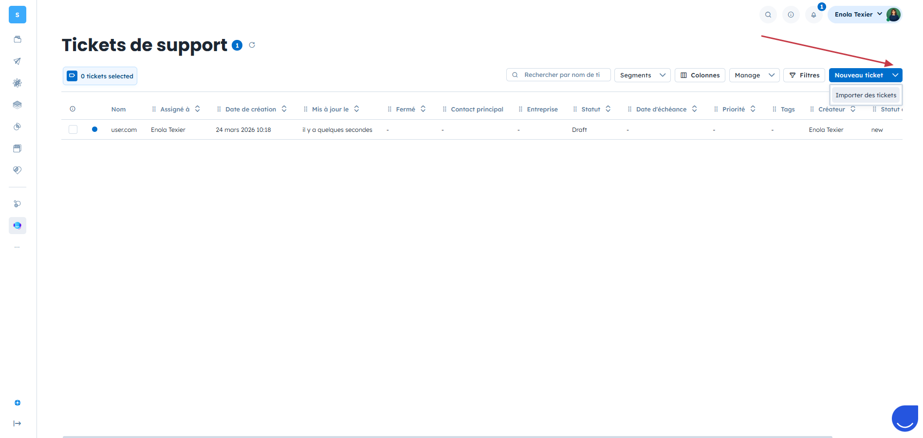 Accédez à “Relation client” → “Tickets de support” → cliquez sur la flèche à côté du bouton “Nouveau ticket”, puis choisissez “Importer des tickets”.