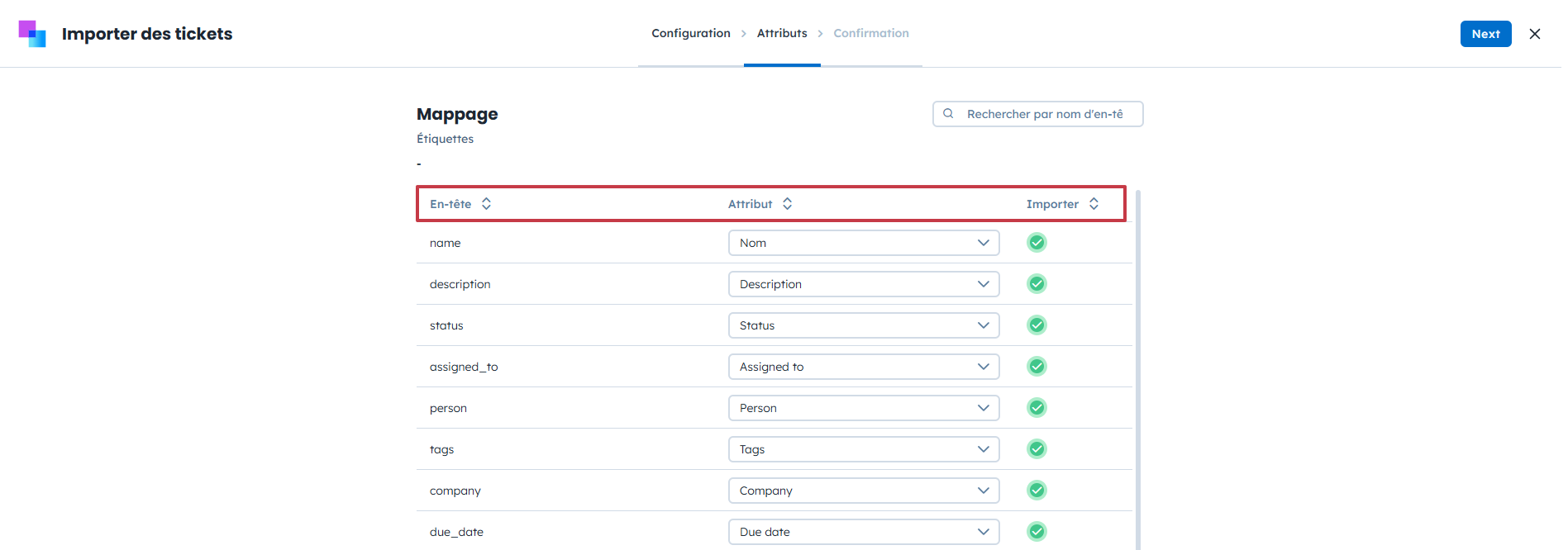 Correspondance avec les attributs standards : Si les colonnes de votre fichier correspondent aux attributs standards, vous pourrez lancer l’import immédiatement.