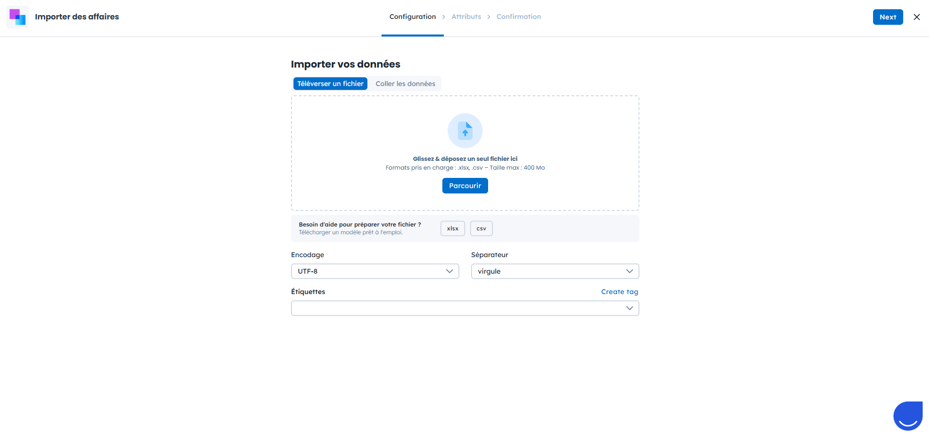 Choisissez d’importer un fichier CSV ou de coller les données.