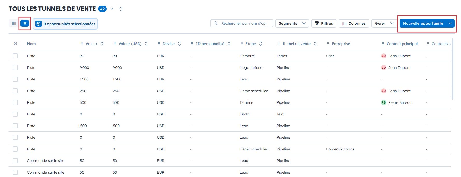 La vue en tableau montre toutes les opportunités de tous vos tunnels, comme pour les sections Contacts ou Entreprises.