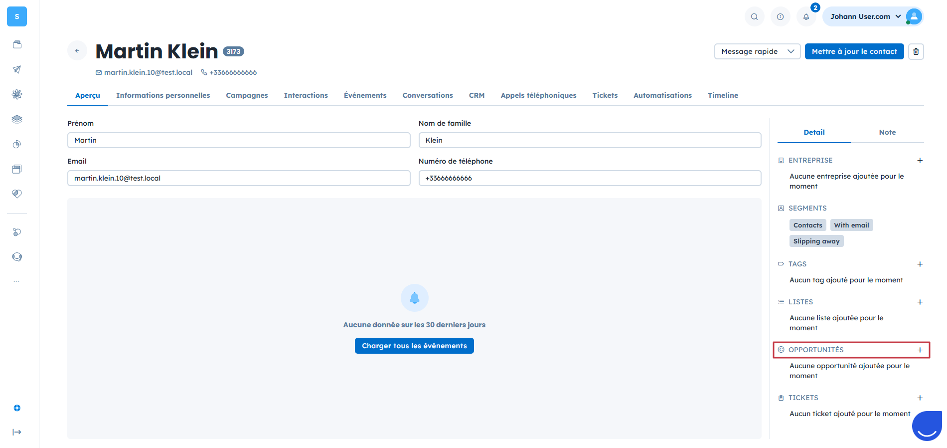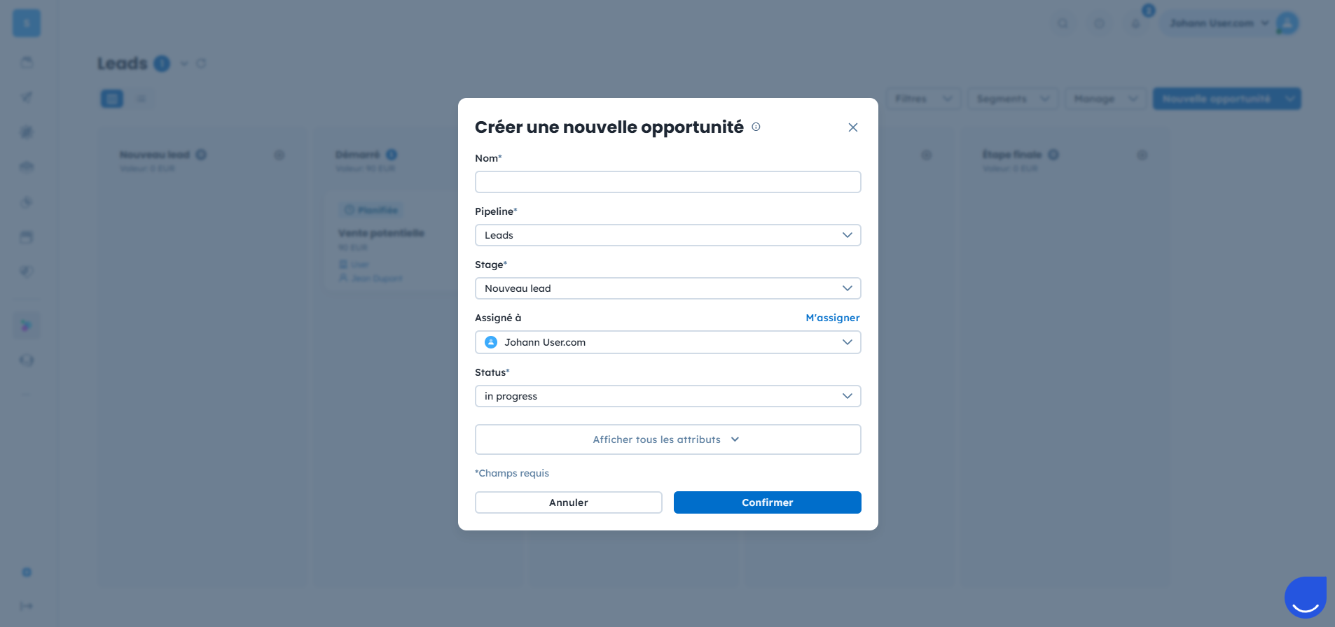 Les opportunités sont au cœur de votre processus de ventes dans User.com. Elles correspondent à des pistes commerciales à suivre, à qualifier, à remporter ou à relancer. Vous pouvez toujours les créer manuellement pour garder un contrôle total, mais User.com propose également des options d’automatisation, d’import et d’API, parfaites pour générer des opportunités automatiquement en fonction du comportement de vos contacts et selon vos flux de données.