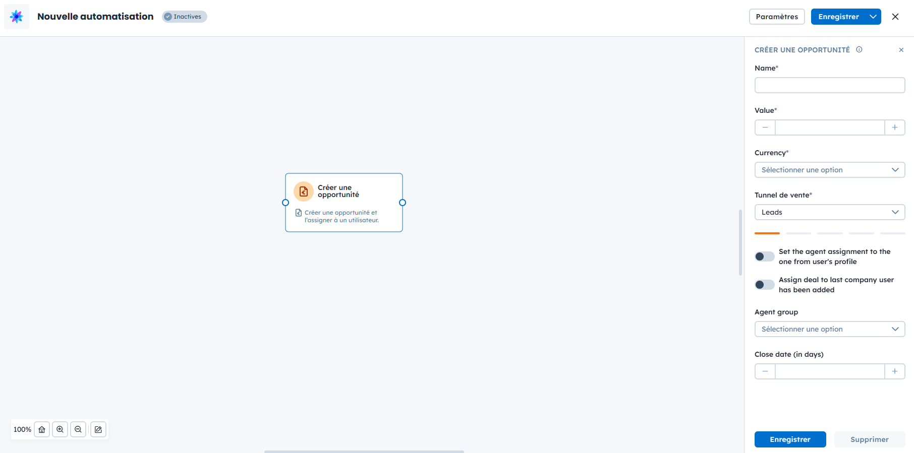 Crée une opportunité dans le tunnel “Ventes”.