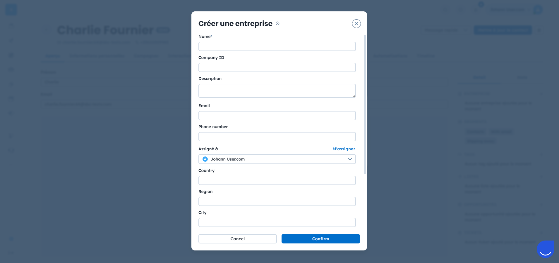 Un account manager intègre un nouveau client B2B. Il crée une entreprise depuis le profil du contact, renseigne le nom de l’entreprise, le pays, le secteur d’activité et assigne le commercial responsable.