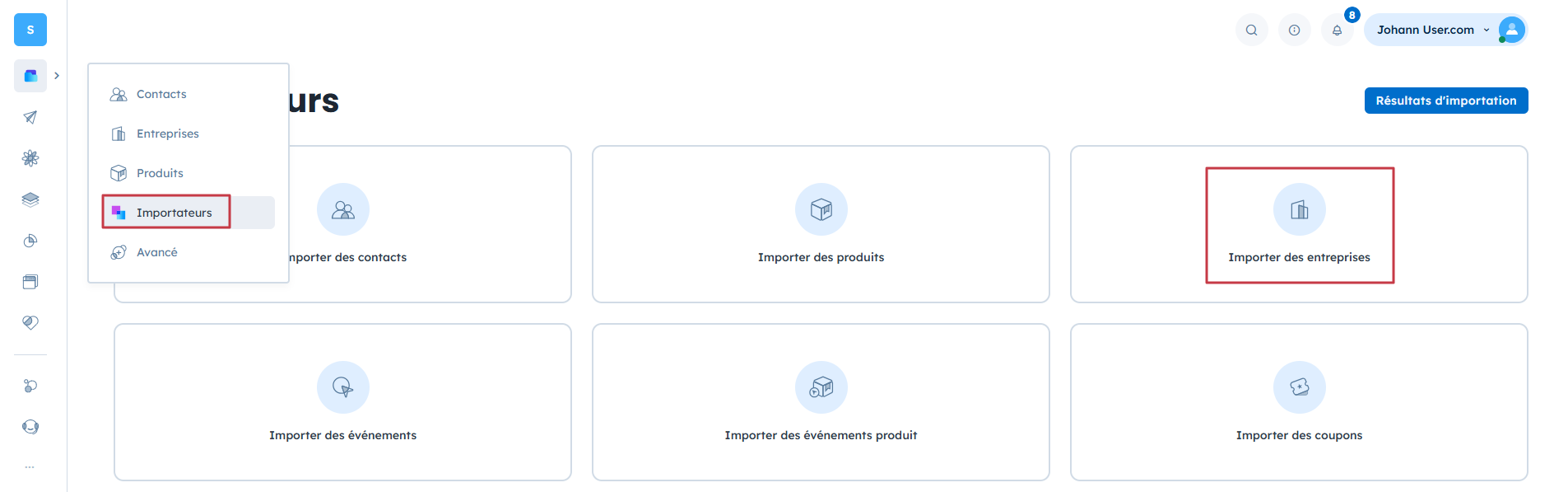 Accédez à “Données” → “Importateurs” → “Importer des entreprises”.