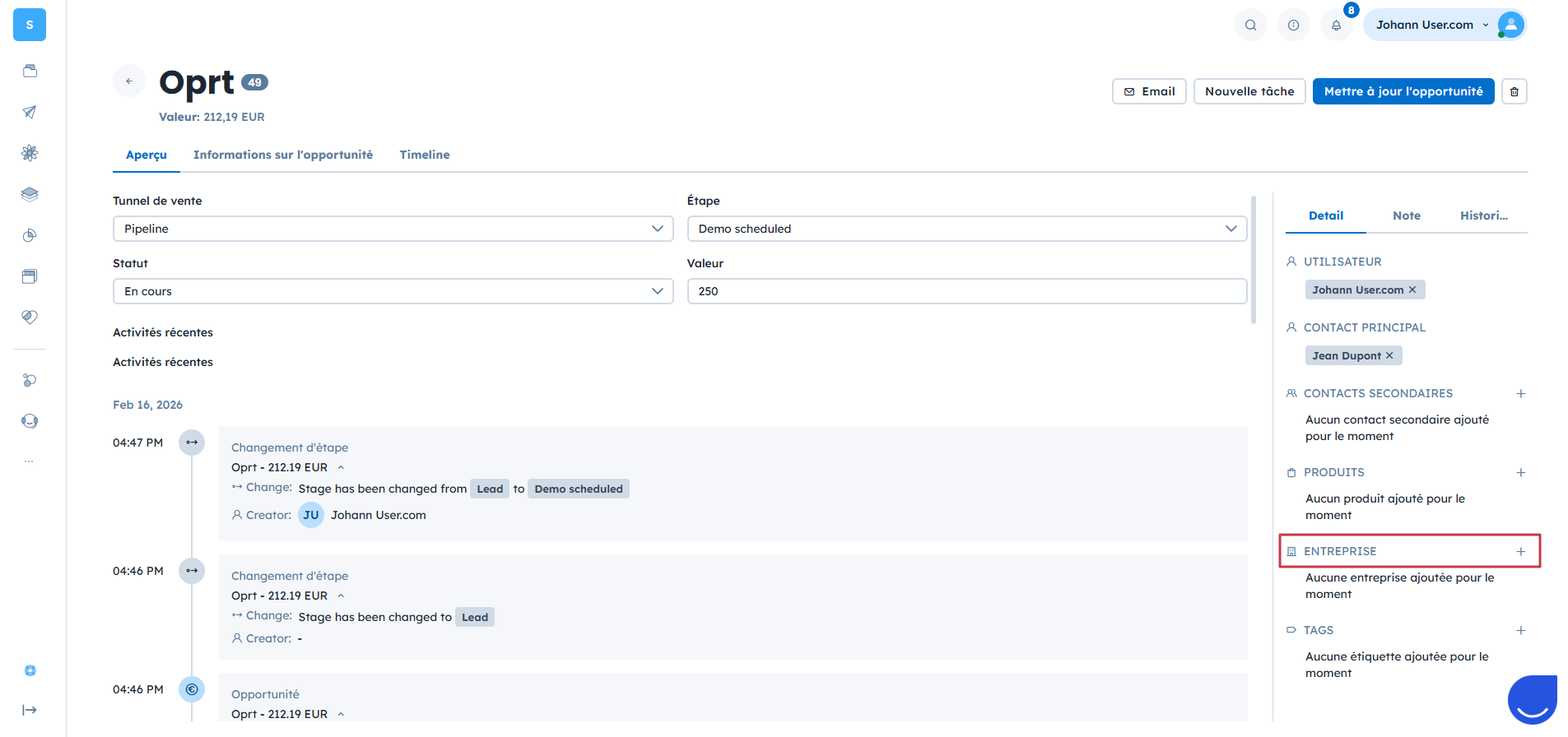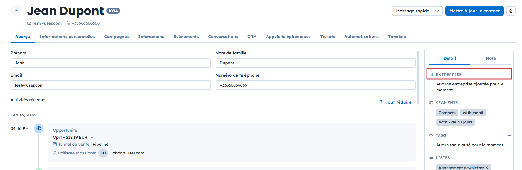 Ouvrez le profil du contact que vous souhaitez rattacher à une entreprise.