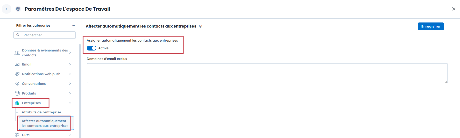 Pour activer l’assignation automatique des contacts aux entreprises :
