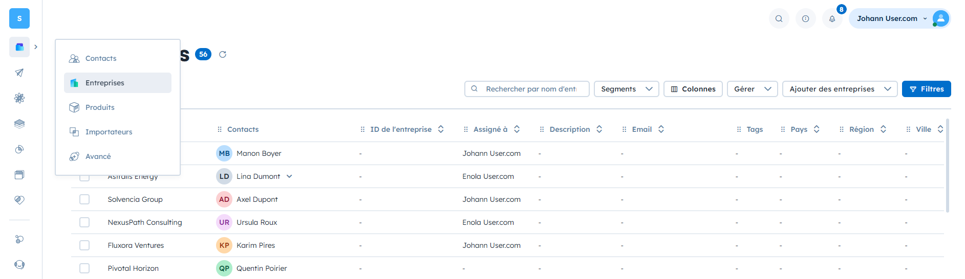 Dans User.com, une entreprise représente une organisation ou une société à laquelle vos contacts sont rattachés. Utiliser les entreprises vous permet de regrouper plusieurs contacts sous une même entité, de suivre les interactions à son échelle et de gérer plus efficacement vos processus de ventes ou de relation client.