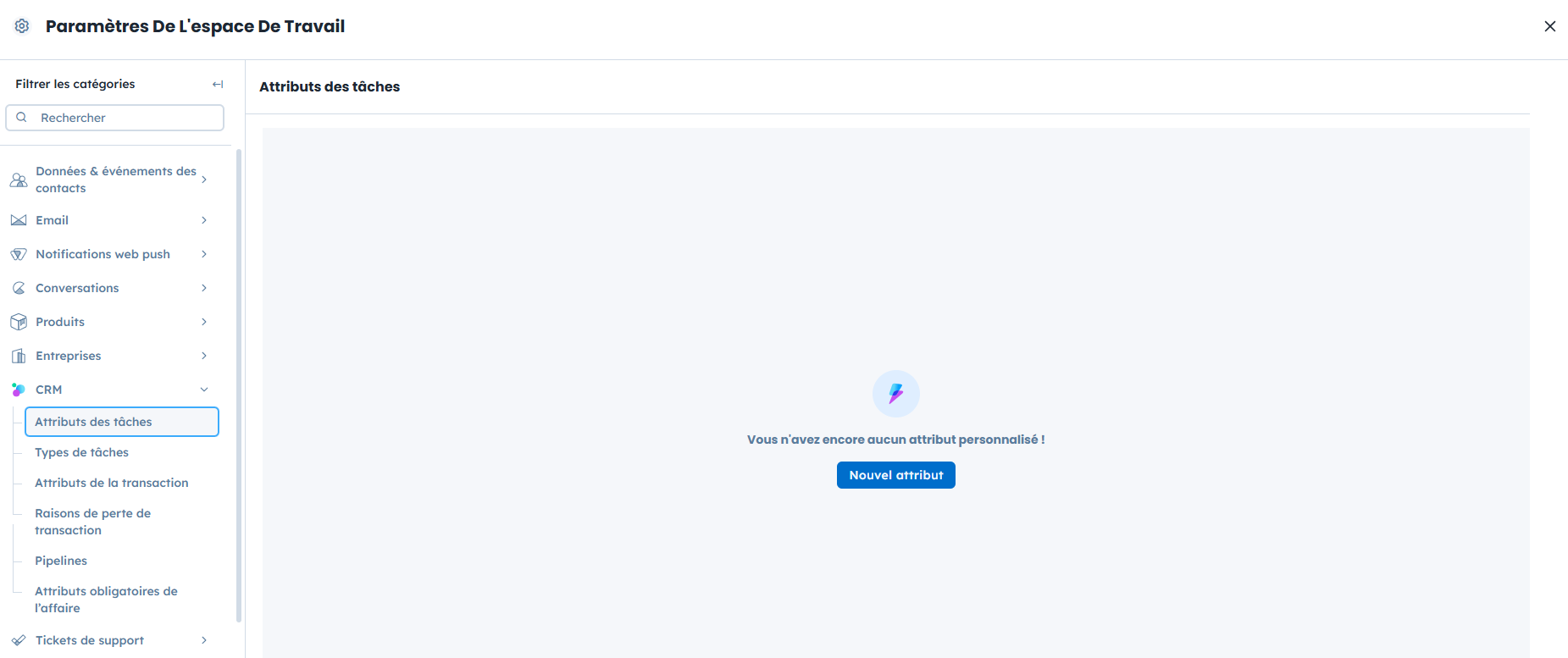 Un attribut est un champ qui décrit un objet, comme un contact, une entreprise ou une opportunité. Pour en savoir plus sur les fondamentaux des attributs, leurs types et leurs cas d’utilisation, consultez l’article dédié.