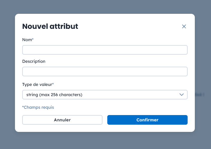 Cliquez sur Nouvel attribut, puis renseignez le champ Nom (nous vous recommandons d’adopter une convention de nommage cohérente pour tous vos attributs afin de garantir la cohérence et de faciliter les intégrations).
