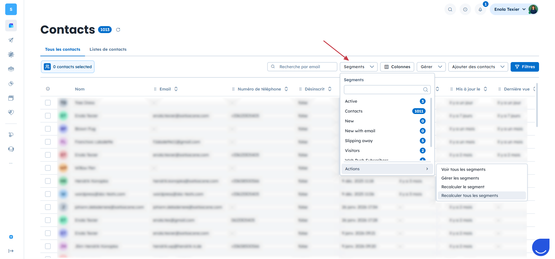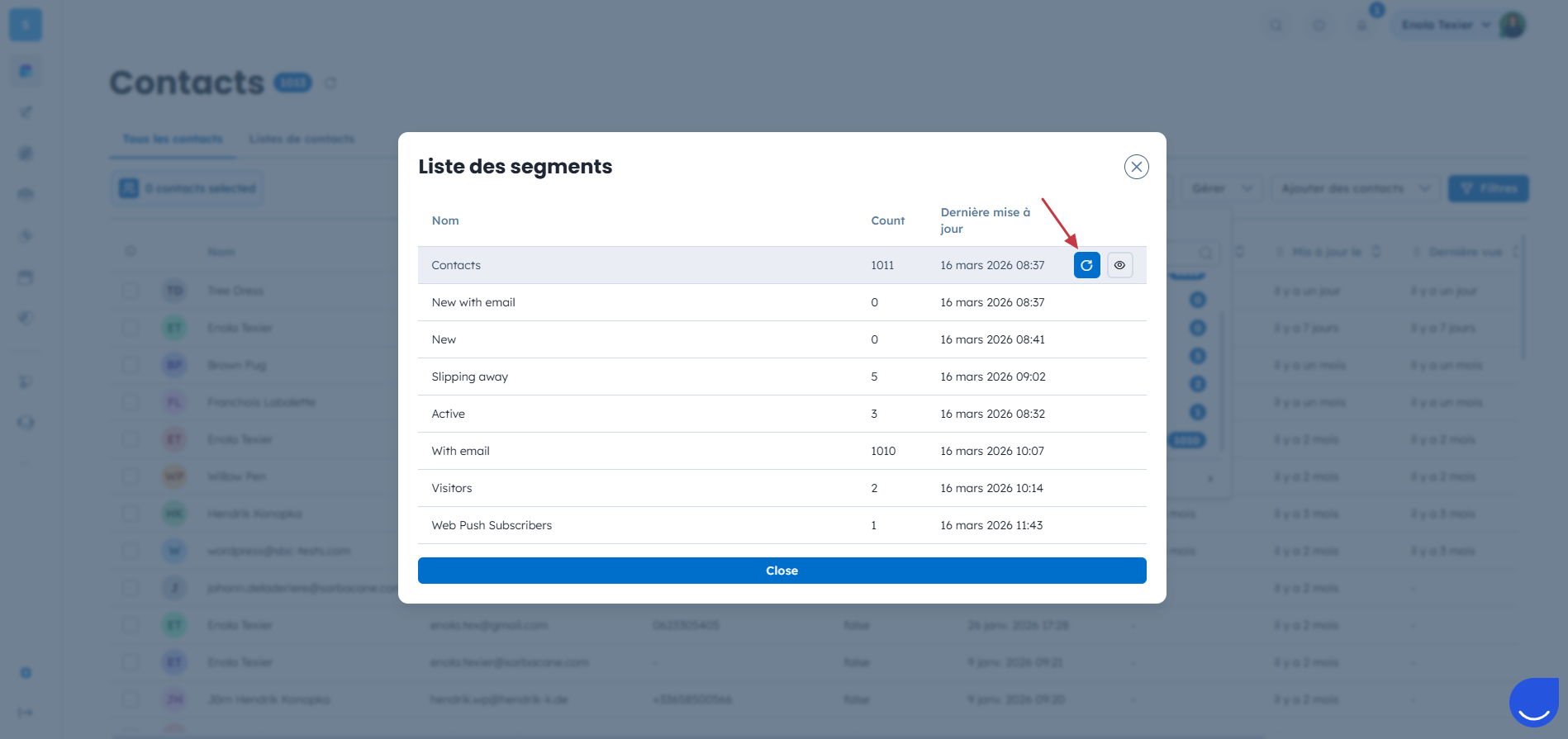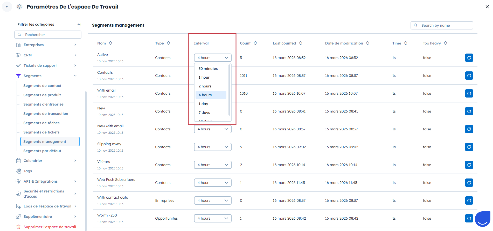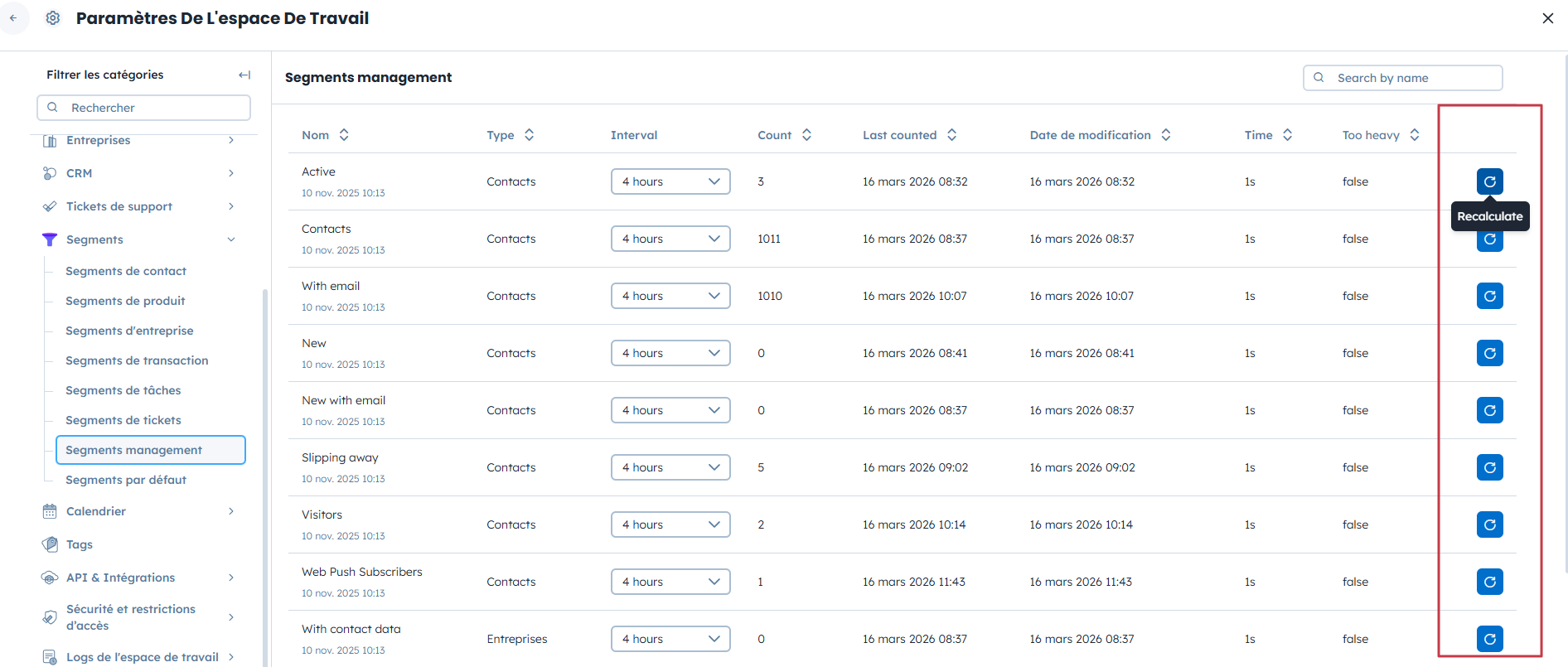 Si vous souhaitez rafraîchir tous les segments liés à un objet (par exemple, tous les segments de contacts), vous pouvez le faire en une seule action.