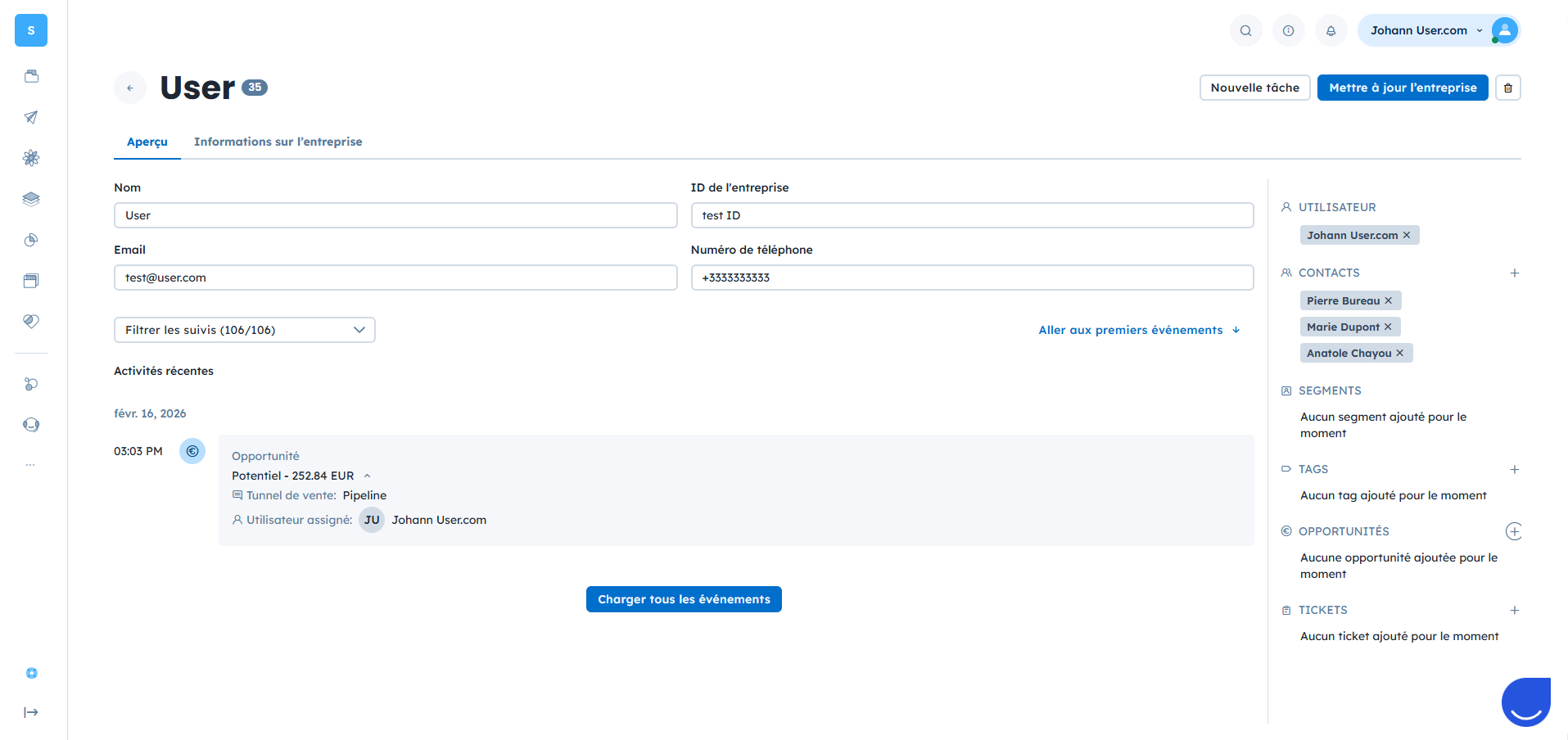 Dans User.com, les entreprises sont une donnée à part entière. Elles sont reliées aux contacts et aux autres objets de la plateforme, ce qui permet de gérer toutes les informations de manière coordonnée.