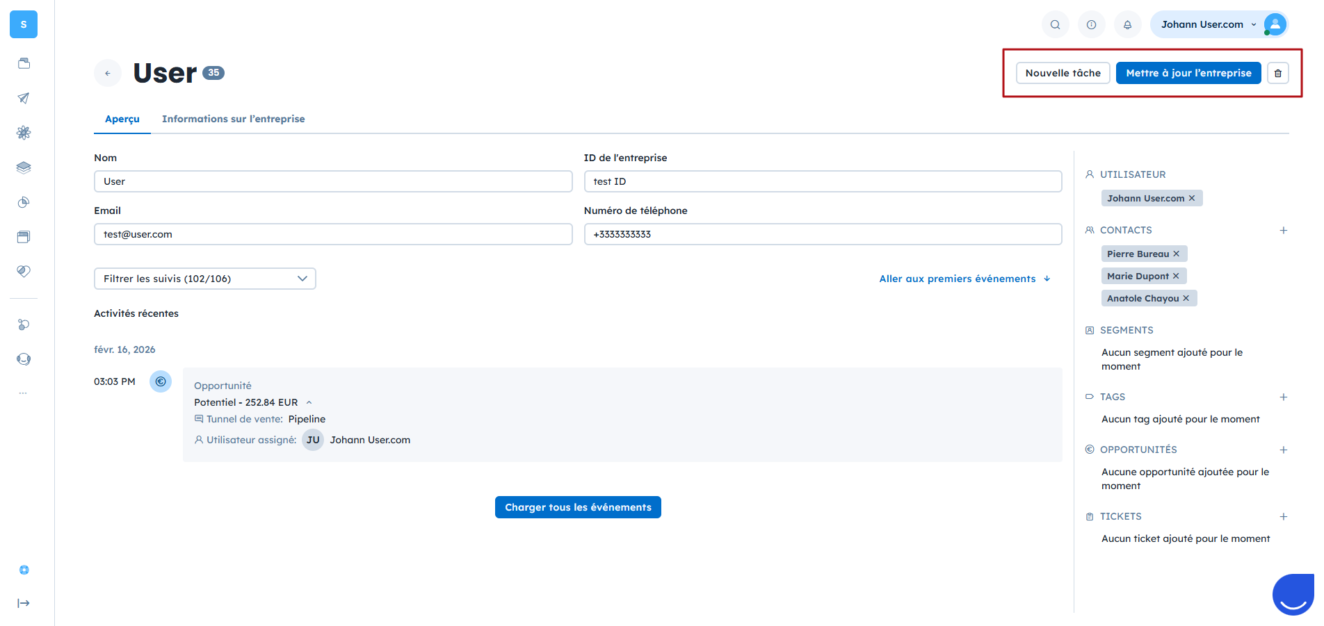 Dans User.com, les entreprises vous permettent d’organiser vos contacts et vos actions commerciales, en particulier dans un contexte B2B lorsque vous échangez avec plusieurs interlocuteurs au sein d’une même organisation.