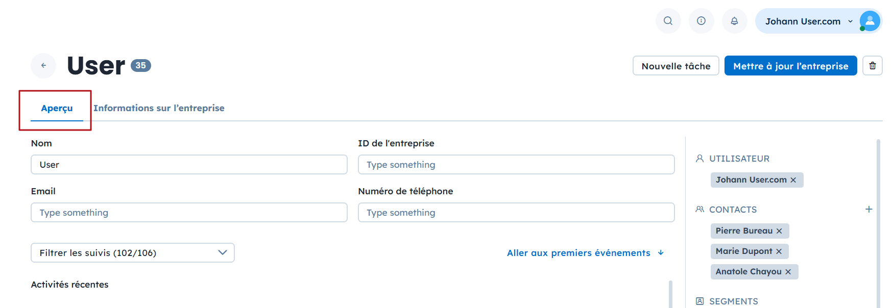 Aperçu - vous y trouverez les informations générales de l’entreprise, telles que le nom, l’identifiant de l’entreprise, l’email, le numéro de téléphone et les activités récentes.